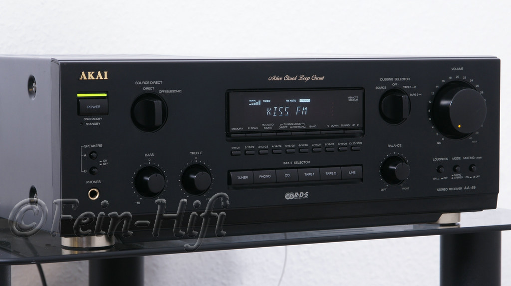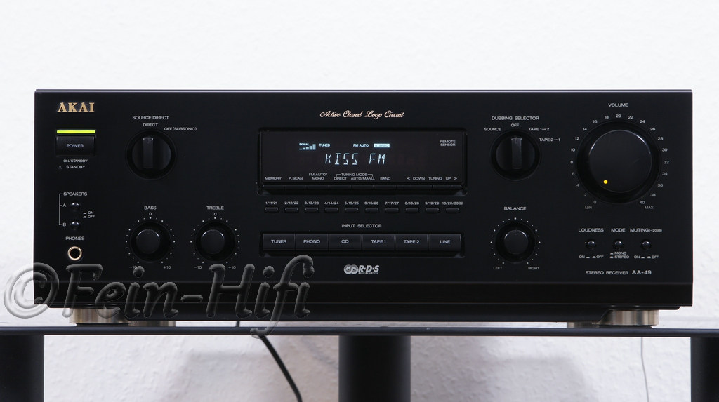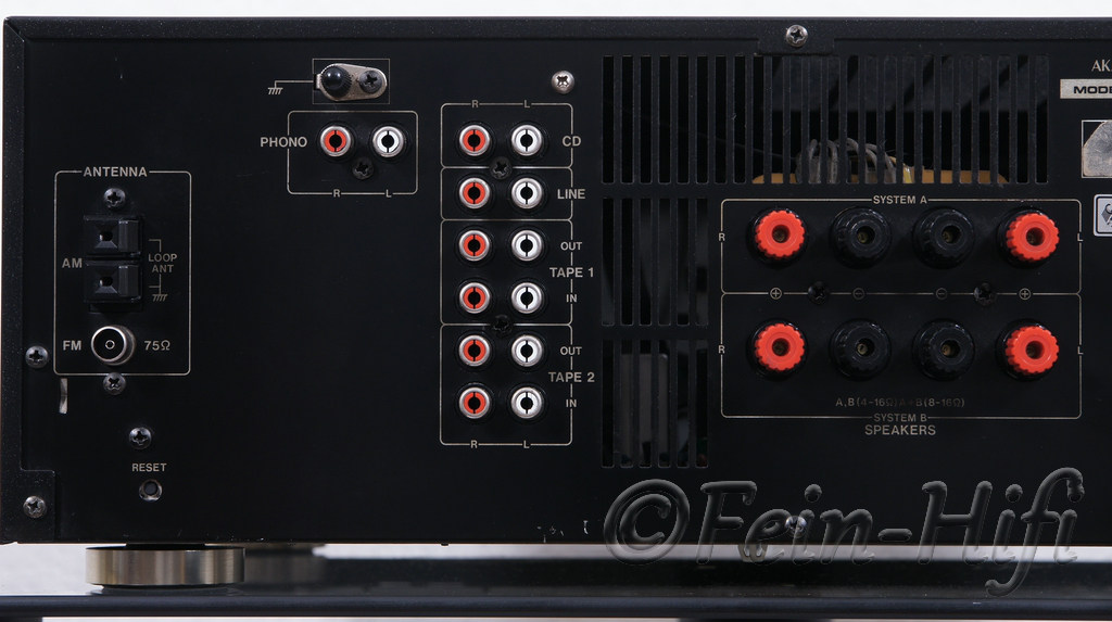 Kräftiger HiFi Receiver / Verstärker von AKAI mit integriertem FM/AM Radioteil und einem ausgezeichneten Klang. Mit 5 Audioeingänge inkl. Phono und Anschlüsse für 4 Lautsprecher, also 2 Boxenpaare separat schaltbar.