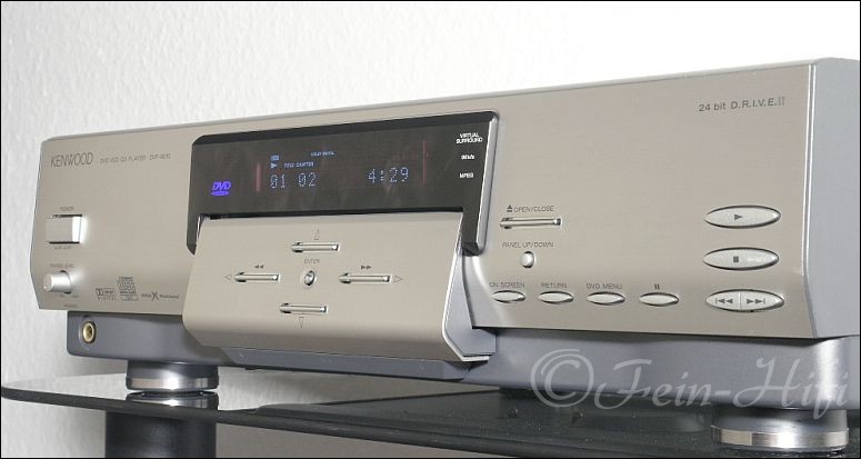 Referenz DVD-Payer von Kenwood in newsilver mit Dolby Digital (AC-3) und DTS Wiedergabe und jede Menge Anschlüsse. Der Player kann zwar kein MP3 oder Divx, dafür ist seine Bild und Tonqualität deutlich besser als solche MP3-Billig-Player. Der Kenwood DVF-9010 besticht nicht nur durch seine exzellenten technischen Daten. Er ist neben seinem Referenzcharakter auf technischem Gebiet auch optisch eine wahre Augenweide. Der hohe Neupreis war durch die hohe Qualität des Players jedoch absolut gerechtfertigt ist. Schon der Lademechanismus bietet eine optische Extravaganz, die sich wohltuend vom Einheitsbrei anderer Geräte abhebt. Die Bildqualität ist überragend und der gute Ton steht dem in nichts nach.