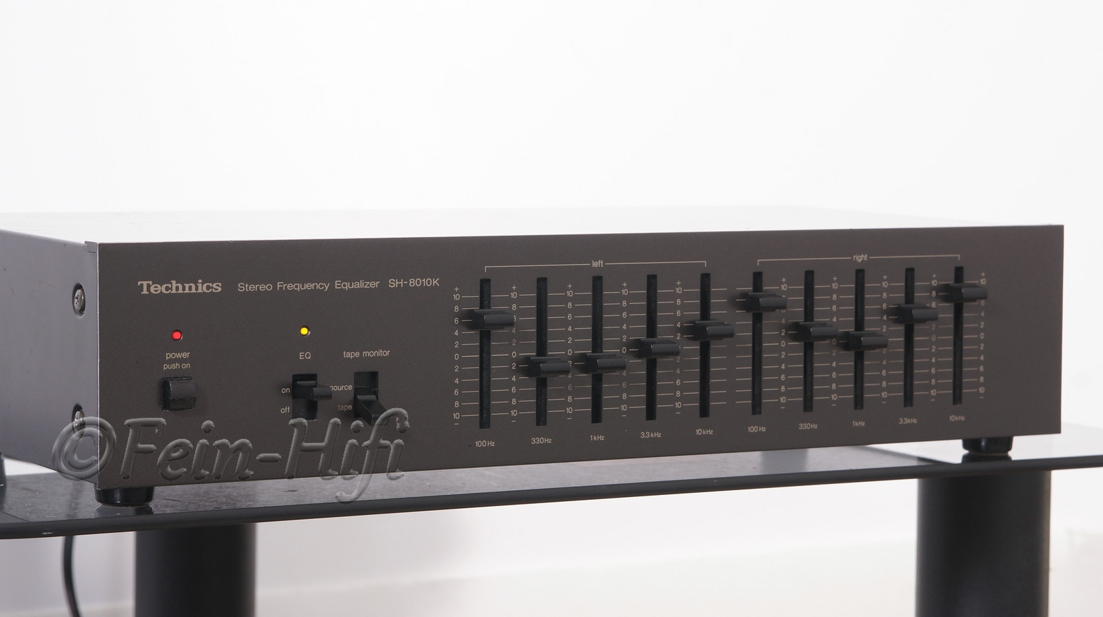 Der Technics SH-8010 ist ein klassischer 5-Band-Equalizer, der dem ernsthaften HiFi-Liebhaber die volle Kontrolle über das Klangbild seiner Anlage ermöglicht. Mit jeweils fünf Regelbereichen pro Kanal lassen sich raumbedingte akustische Schwächen gezielt ausgleichen oder ganz individuelle Klangvorlieben realisieren. Die Schiebepotentiometer verfügen über einen großzügigen Regelbereich von $pm 12$ dB und sind in präzisen Intervallen von jeweils 1,6 Oktaven gestaffelt.Technisch überzeugt der SH-8010 durch eine beeindruckende Linearität: In der neutralen „0“-Stellung umfasst der Frequenzgang einen enormen Bereich von 10 Hz bis 100 kHz. Dank eines hervorragenden Fremdspannungsabstands von 101 dB (IHF '66) und einem extrem niedrigen Klirrfaktor von nur 0,05 % bleibt das Musiksignal absolut rein und unverfälscht. Ein besonders praktisches Feature ist der zentrale Bypass-Schalter, mit dem der gesamte Equalizer per Knopfdruck aus dem Signalweg genommen werden kann, um die vorgenommenen Einstellungen jederzeit im Direktvergleich zu überprüfen. Der Anschluss erfolgt unkompliziert über die Tape-Monitor-Schleife oder am Adaptor (Main-In/Pre-Out) Anschluss eines Verstärkers oder Receivers.