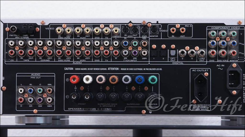 Heimkino Receiver mit mit mehreren Surround Formaten wie Dolby Digital EX, DTS-ES, ProLogic IIx usw. Das Gerät hat Ausgänge für 7 Lautsprecher und 4 Digitaleingänge (je 2x optisch und koaxial), 7 analoge Audio / Video Anschlüsse und einen 7.1 Chincheingang.