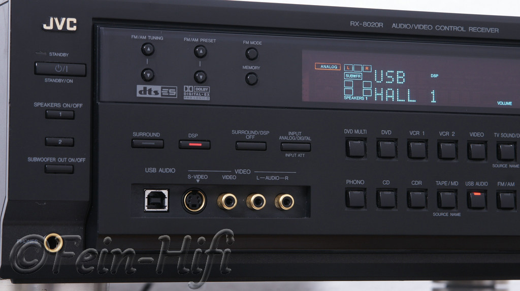 Heimkino Receiver mit Surround Tonformaten wie Dolby Digital-EX, DTS-ES und ProLogic-II sowie weitere DSP Klangfeldern. Der Receiver ist ideal für Home Cinema oder auch zum Musikhören ob nun im Stereo oder Mehrkanalbetrieb. Das Gerät hat 4 Digitaleingänge, 9 Analogeingänge inkl. Phono Plattenspieleranschluss, einen Front USB Eingang sowie Anschlüsse für 2 Frontspeakerpaare A/B, Rear, Center und Subwoofer.
