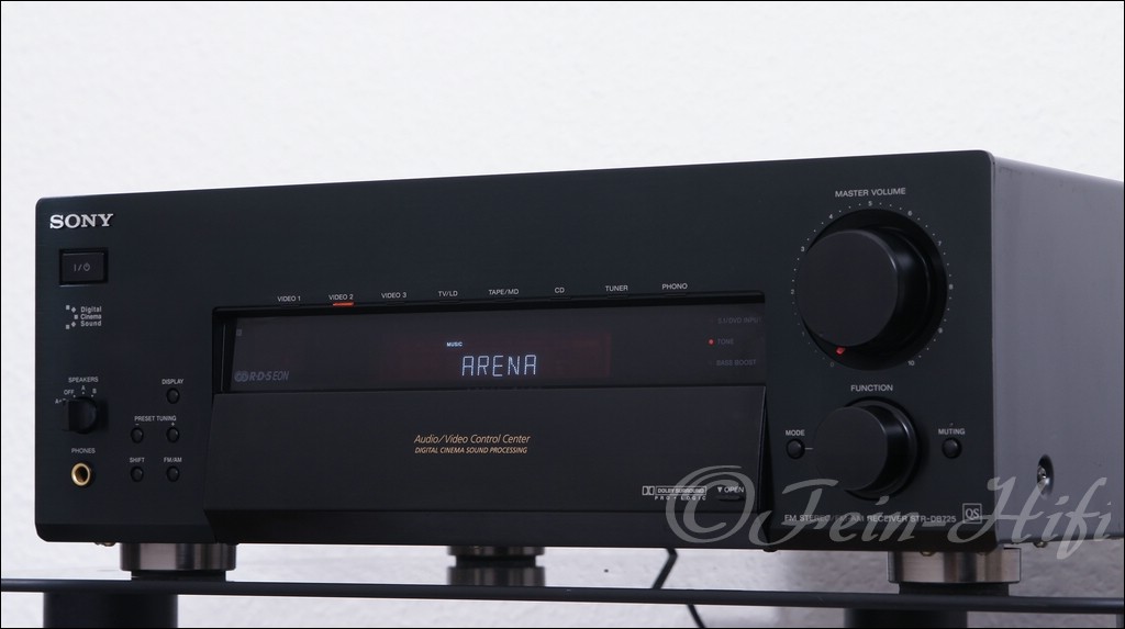 Surround Receiver Sony STR-DB 725 QS der Sony QS-Reihe mit Digital Cinema Sound (DCS), DSP und ProLogic sowie Cinemas Studio EX. Dieser Receiver beherrscht das "Cinema Studio EX" . Mit 400 Watt Ausgangsleistung und vielen Anschlüssmöglichkeiten (bis zu 7 Geräte inkl. Phono). Außerdem hat er einen analogen 5.1 Chincheingang. Das Gerät kann man auch mit nur 2 Boxen im Stereo betreiben.