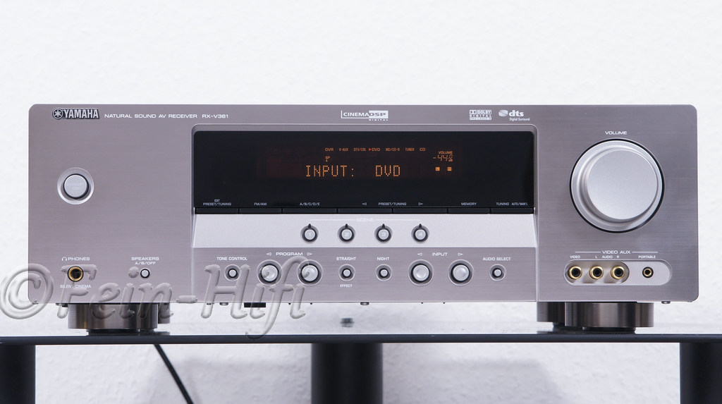 Mehrkanal A/V Receiver Yamaha RX-V361 mit Dolby Digital, DTS, Pro-Logic II und DSP . Das Gerät hat 3 Digitaleingänge sowie insgesamt 6 Audio oder AV Eingänge und Anschlüsse für 2 Frontlautsprecherpaare, 1 Rear-Paar, einen Center und für einen aktiven Subwoofer.