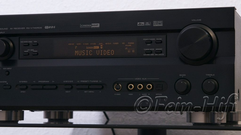 Massiver, schwerer (13kg) Heimkino Receiver mit Dolby Digital EX , ProLogicII, DTS und DSP (21 verschiedene Klangfelder) und reichlich Anschlussmöglichkeiten wie 5 Digitaleingänge, 8 Audio / Video Anschlüsse und 8 Lautsprecheranschlüsse. Das Gerät hat eine Ausgangsleistung von bis zu 6x 140 WATT DIN.