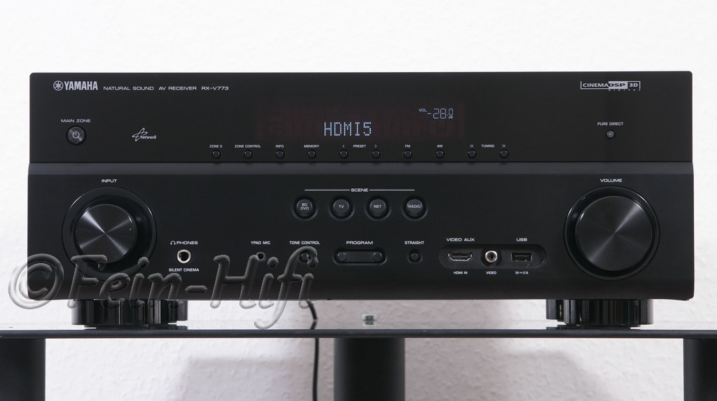 Hochwertiger Heimkino Receiver mit sehr guten Klangeigenschaften sowohl im Surround als auch im Stereo Betrieb. Das Gerät hat eine enorme Ausstattung. Die HDMI-Ein- und Ausgänge des RX-V773 unterstützen 4K Video Image Pass-Through. Zusätzlich ist eine 4K Hochskalierung von Bildern niedriger Auflösung möglich. Eine Kompatibilität mit den neuesten Super High Res Videoformaten ist dadurch gegeben. Der RX-V773 unterstützt eine Auswahl an Netzwerkfunktionen und ermöglicht den Zugriff auf zusätzliche Quellen. Sie können den Receiver mit Ihrem Heimnetzwerk verbinden, um das Internetradio zu nutzen. Dank der AV Controller App (aus dem Appstore) können Sie auch mit Ihrem Apple- oder Android-Gerät diverse Funktionen des Receivers steuern. Das Gerät unterstützt AirPlay, sodass Sie Ihre Lieblingsmusik von iPod touch, iPhone, iPad, iTunes auf MAC oder PC direkt zum Receiver streamen können – mit voller Leistung und Präzision. Insgesamt hat das Gerät 6 HDMI Eingänge, 2 HDMI Ausgänge, 4 Digitaleingänge, 5x Analog IN (inkl. einen Phonoanschluss) sowie einen Front USB und einen Ethernet LAN Anschluss. Man kann an dem Receiver bis zu 9 Lautsprecher und 2 Subwoofer betreiben, auch 2-Zonen Betrieb ist möglich.
