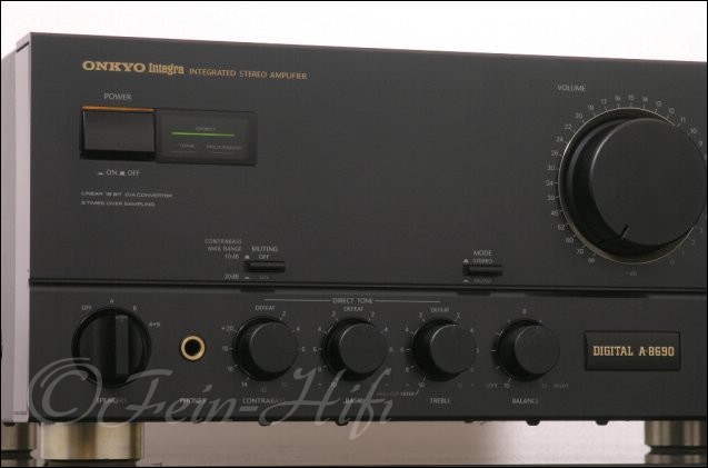 Kraftvoller Verstärker der Highend Onkyo Integra-Serie mit viel Power und einer hochwerigen Technologie . Der A-8690 verfügt neben den klassischen Analog-Eingänge über digitale Ein- und Ausgänge für Lichtleiter und Coaxialkabel. 18-Bit-Digitalwandler mit 8-fach-Oversampling sorgen für die extrem hochauflösende Signalverarbeitung und damit eine detailgenaue Klangreproduktion. Das neuentwickelte OPTO-DRIVE-System sorgt für die Unterdrückung von Störsignalen in den D/A-Wandlern, die dynamische Leistung des A-8690 liegt bei 2 x 305 W. Dabei können über die Source-Direkt-Schaltung digitale Musikaufzeichnungen von der CD oder vom DAT-Bandgerät absolut unverfälscht wiedergegeben werden.