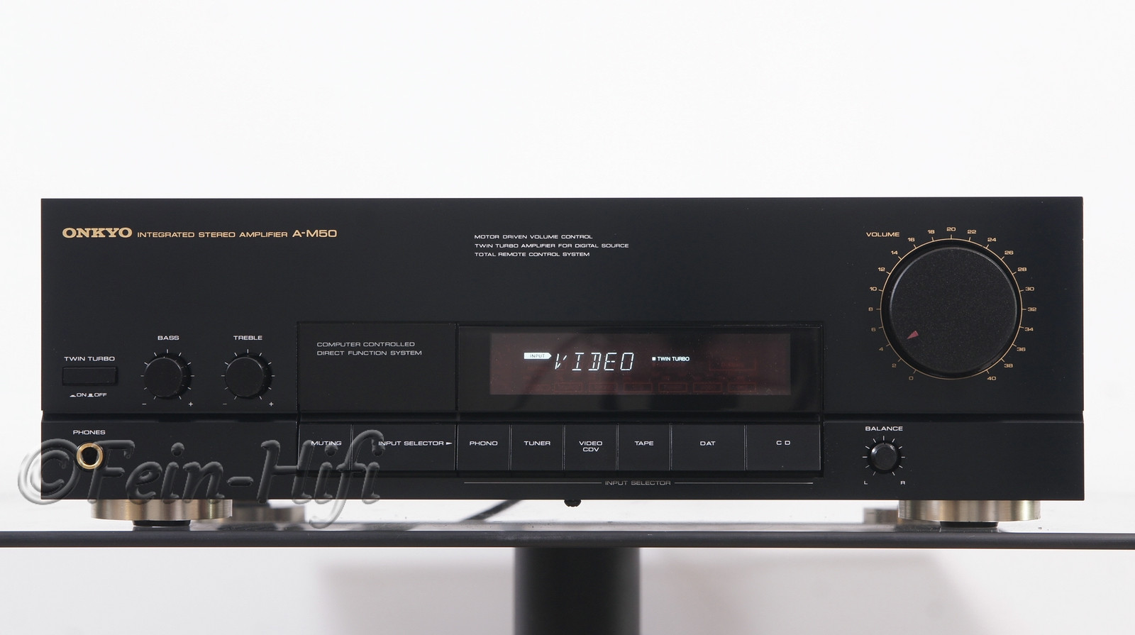 Der Onkyo A-M50 ist ein hochwertiger MIDI-Vollverstärker, der als kraftvolles Herzstück kompakter HiFi-Systeme konzipiert wurde. Während die Nennleistung konservativ mit 2 x 40 Watt an 8 Ohm angegeben wird, verfügt das Gerät über eine Sinusleistung von 2 x 60 Watt an 4 Ohm und bietet somit hohe Leistungsreserven für eine dynamische Wiedergabe. Ein technisches Highlight ist die lautstärkeabhängige TWIN-TURBO-Schaltung, die für eine gehörrichtige Bass- und Höhenanhebung sorgt und zusammen mit der Selective Tone Control ein besonders voluminöses Klangbild ermöglicht. Für eine präzise Anpassung stehen zudem klassische Klangregler für Bass und Höhen mit einem Bereich von jeweils ± 10 dB zur Verfügung. Die Ausstattung ist mit einer digitalen Anzeige der aktiven Tonquelle äußerst komfortabel. Insgesamt stehen sechs Eingänge für Phono MM, Video, CD, Tuner, Tape und DAT zur Verfügung, ergänzt durch zwei Ausgänge für Tape und DAT. Zusätzlich bietet der Verstärker einen speziellen Ein- und Ausgang für einen externen Equalizer, Anschlüsse für zwei Lautsprecher sowie einen Kopfhöreranschluss an der Front.